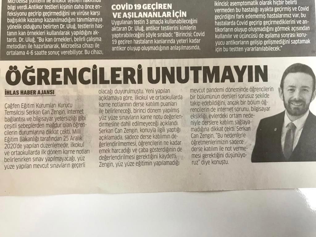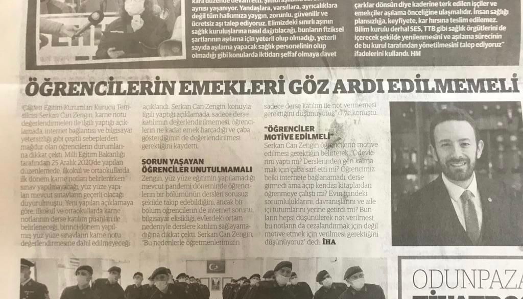 Serkan Can Zengin, yüz yüze eğitimin yapılamadığı mevcut pandemi döneminde öğrencilerin bir bölümünün dersleri sorusuz şekilde takip edebildiğini, ancak bir bölüm öğrencilerin de internet sorunu, bilgisayar eksikliği, evlerdeki ortam nedeniyle derslere katılım sağlayamadığına dikkat çekti. Zengin, “Bu nedenlerle öğretmenlerimizin sadece derse katılım ile not vermemesi gerektiğini düşünüyoruz” dedi.